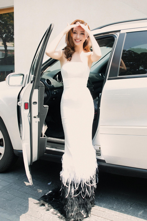 Jennifer Phạm lái xe đến địa điểm diễn ra sự kiện. Cô diện váy dạ hội trắng đính lông phần chân váy của nhà thiết kế Việt kiều - Kate Châu Phạm.