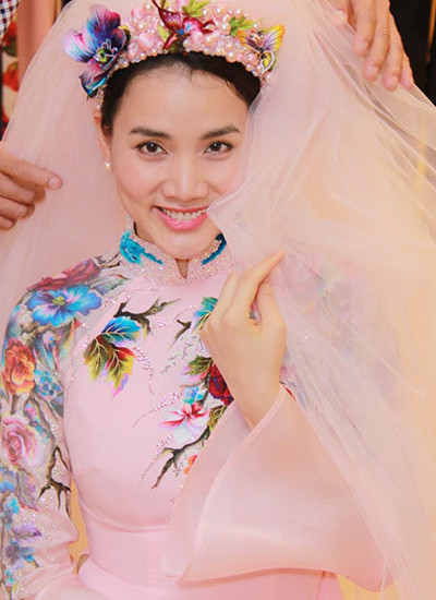 Trang Nhung làm cô dâu dịu dàng khi sử dụng phấn hồng cho má và mắt. Son môi dịu nhẹ tôn nét đẹp e ấp của cô trong ngày trọng đại.