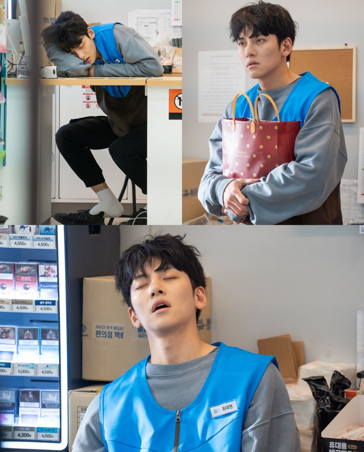 Trong phim đang chiếu Cửa Hàng Tiện Lợi Saet Byul, Ji Chang Wook đóng vai ông chủ kiêm nhân viên của một cửa hàng tiện lợi. Hình ảnh chàng nam thần mặc chiếc áo đồng phục xanh dương, ngồi gà gật ở quầy thu tiền vì cửa tiệm ế khách đã khiến khán giả nhìn mà thương.