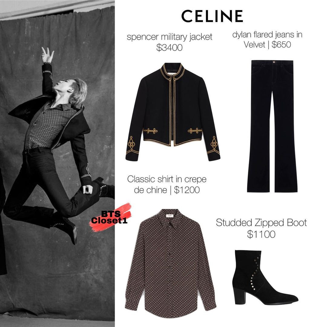 Trong bức ảnh này, một lần nữa Jimin lại phô diễn khả năng vũ đạo “hiếm có khó tìm” của mình. Nam idol mặc set đồ phong cách cổ điển đặc trưng, toàn bộ sản phẩm đều của thương hiệu CELINE, với áo jacket phong cách quân đội có giá khoảng hơn 79 triệu đồng, quần ống hơi loe có giá khoảng 15 triệu đồng, áo sơ mi có giá khoảng 28 triệu đồng và đôi bốt da lộn cao gót đính kim loại có giá khoảng 26 triệu đồng.