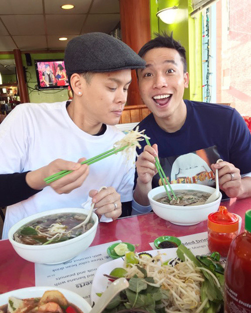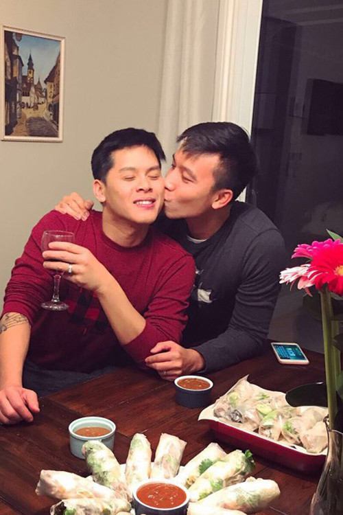 Nhiệm Huỳnh (phải) là nhân viên văn phòng. Anh và John Huy Trần quen nhau được gần chín năm. Biên đạo múa nhận xét bạn trai lịch thiệp, thông minh và vui tính, rất "điên" giống anh.