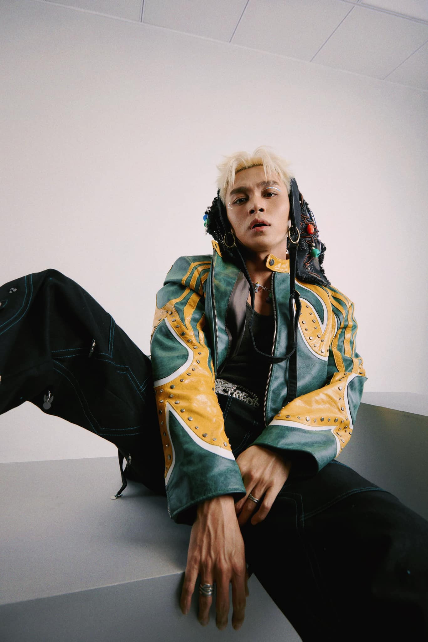 Điểm nhấn đặc biệt là chiếc áo khoác được làm từ da thật giúp Jun Phạm tự tin khoe cá tính mạnh mẽ, cool ngầu. Ngoài ra, những chi tiết nhỏ như đinh tán, hạt đá hay các phụ kiện kim loại đầu thỏ cắt laser được tính toán và đưa vào trang phục nhằm tăng độ bắt sáng trên sân khấu.