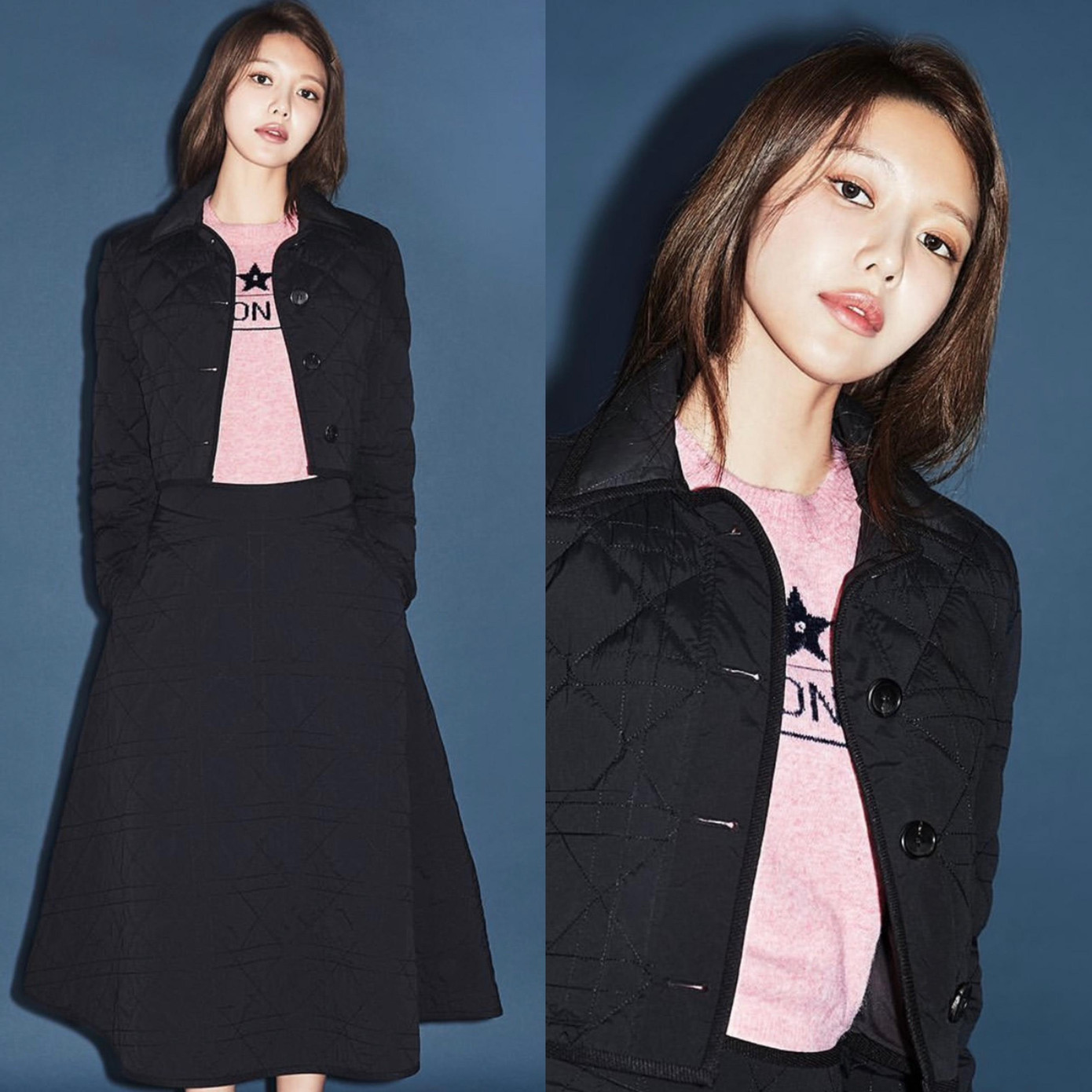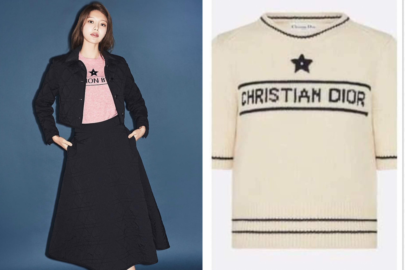 Với mẫu áo len Sooyoung diện trong ảnh dưới, có thể nhận thấy rõ ràng chi tiết ngôi sao đặc trưng của Dior đã được E.b.m "bê sang" nguyên vẹn. Font chữ in tên hãng bố cục giữa hai đường kẻ cũng không khác gì so với bản gốc.
