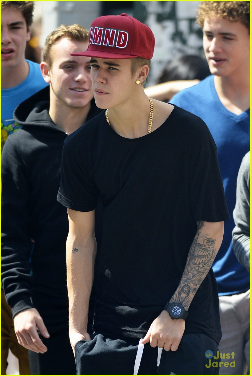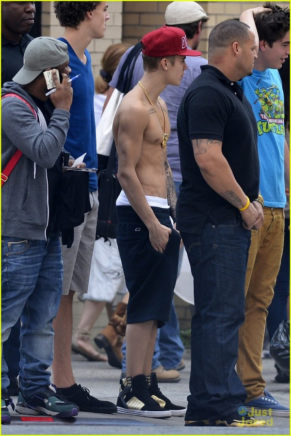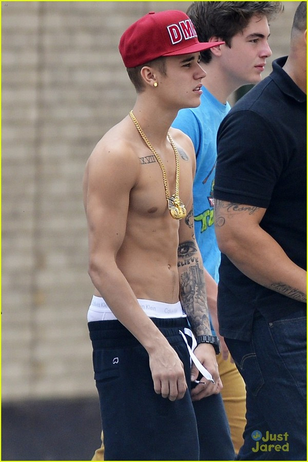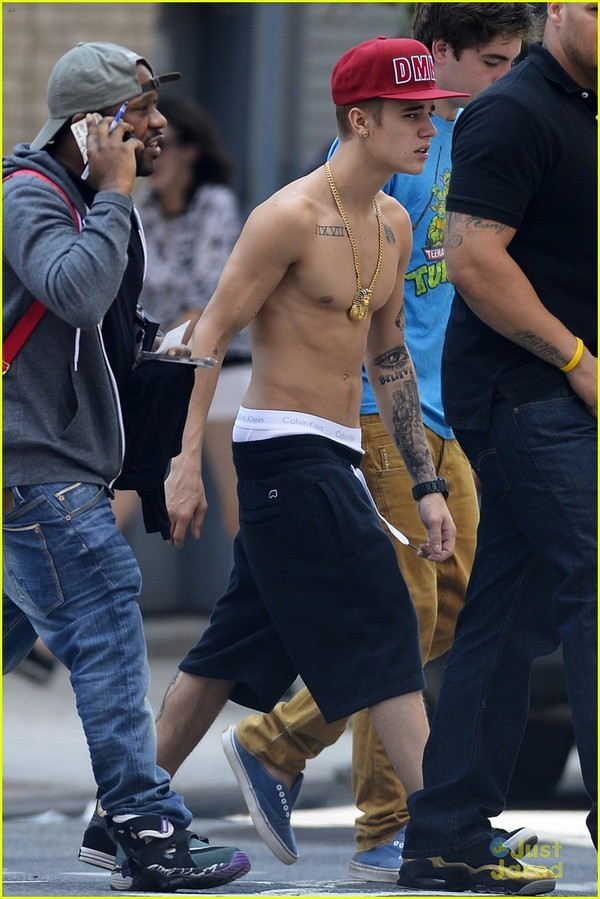 Và tất nhiên việc này không thể thoát khỏi ống kính của các tay săn ảnh lúc nào cũng túc trực theo sát nam ca sĩ. Sau khi tặng áo cho fan xong, Justin đã gây sự chú ý với việc để ngực trần khoe body trước mắt ‘bàn dân thiên hạ’