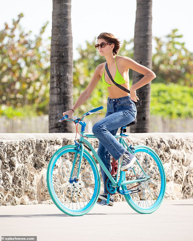 Nàng mẫu sinh năm 2001 mặc áo bơi màu xanh neon, quần bò và giầy thể thao năng động, đạp xe trông vô cùng sexy, thần thái hút hồn.