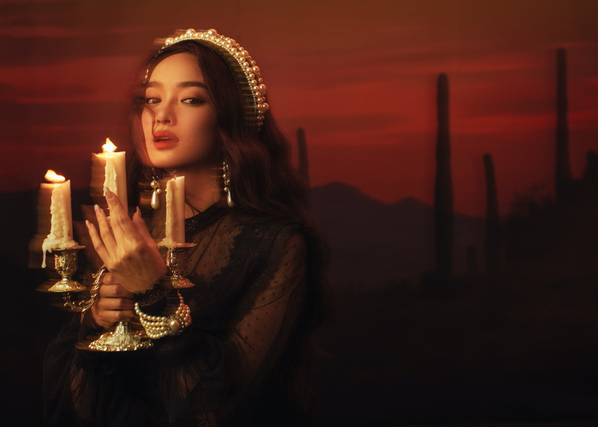 Trên tông nền đỏ, trắng, đen kết hợp cùng bối cảnh nguyệt thực lấy cảm hứng từ Tiệc Trăng Máu, nữ diễn viên hóa thân thành quý cô sở hữu thần thái lạnh lùng, sắc sảo lẫn sang chảnh.