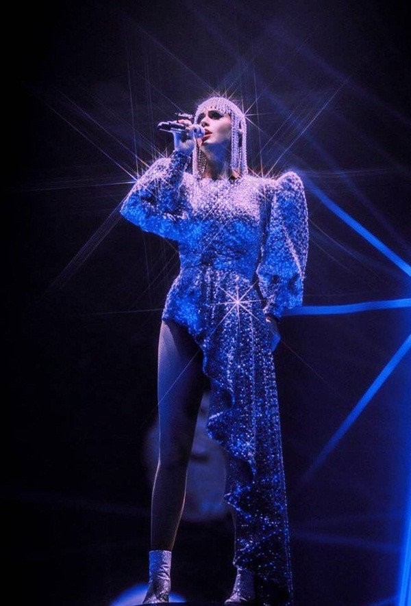 Nữ ca sĩ trong bộ váy lấp lánh màu ánh bạc có cầu vai phồng.