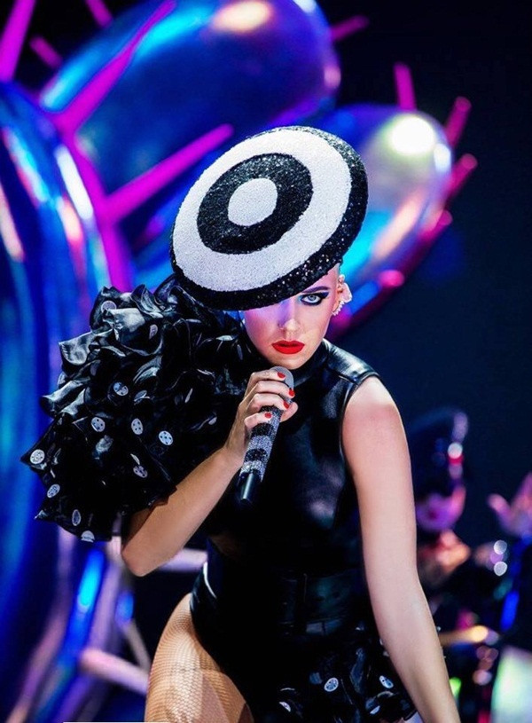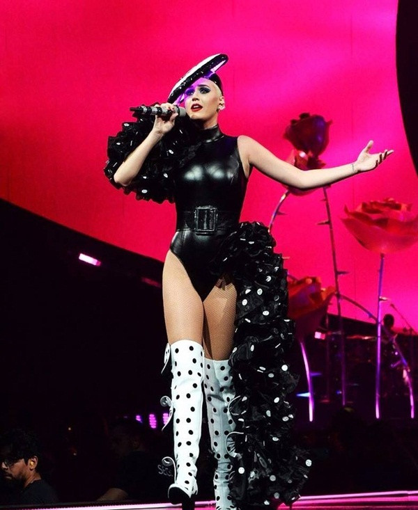 Katy Perry cá tính trong bộ bodysuit bất đối xứng với điểm nhấn là phần bèo nhún.