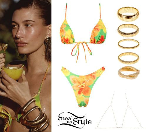 Những bộ bikini màu sắc rực rỡ, nổi bật với các bản in hoa lá luôn là đối thủ nặng ký trên đường đua xu hướng. Bà bầu Hailey Bieber luôn dẫn đầu mọi xu hướng với bộ đồ bơi nhuộm màu sắc tươi sáng.