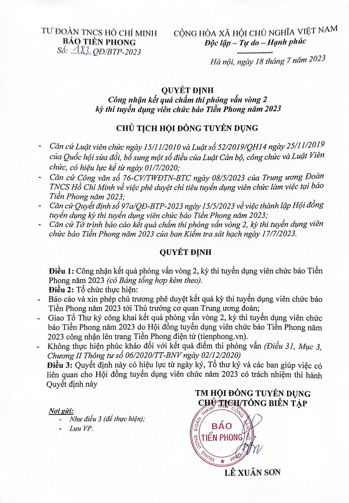 TPO - Hội đồng tuyển dụng viên chức Báo Tiền Phong năm 2023 công bố kết quả chấm thi phỏng vấn vòng 2 Kỳ thi tuyển dụng viên chức Báo Tiền Phong năm 2023. Chi tiết điểm thi trong file đính kèm.