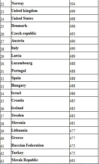 Đối với lĩnh vực Đọc hiểu: Việt Nam đứng thứ 19/65, điểm trung bình là 496 thì Việt Nam đạt 508, như vậy, năng lực Đọc hiểu của HS VN cao hơn chuẩn năng lực của OECD (xem bảng dưới).