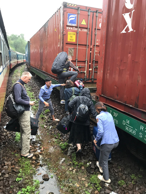Mưa lớn vẫn đang diễn ra tại khu vực sạt lở. Sau 40 phút dừng tàu hiện trưởng tàu đang phát lệnh các nhân viên về vị trí đợi lệnh nhả hãm tay đẩy tàu về lại ga Lăng Cô chờ thông đường.