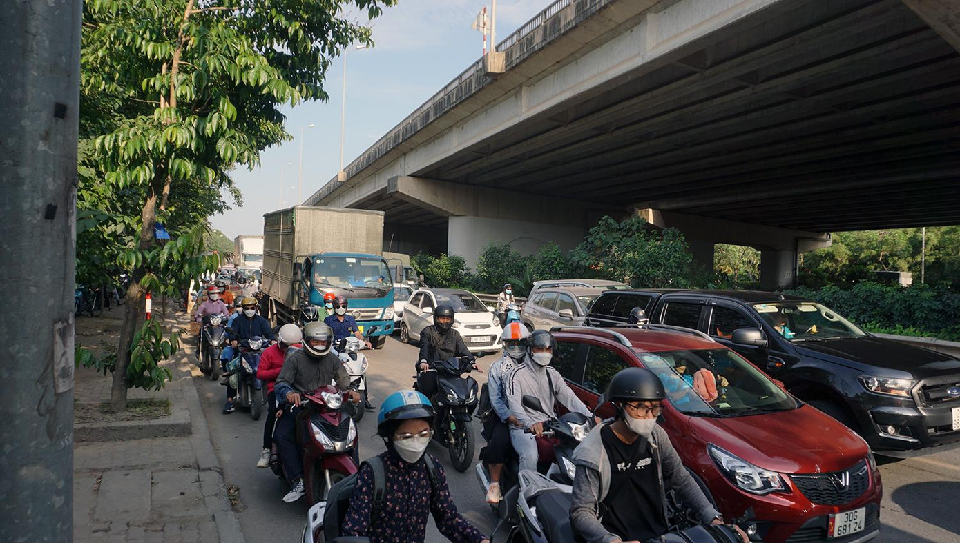 | Nhiều người mất 10-15 phút mới đi qua được đoạn đường ùn ứ. Ảnh: Thanh Hà |