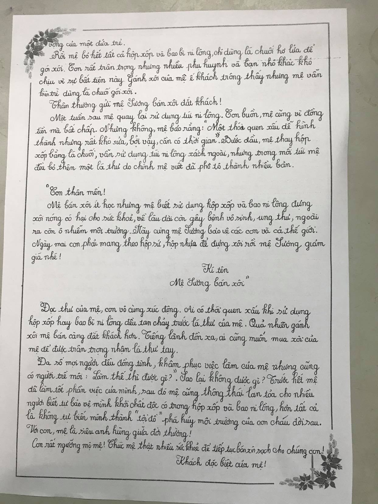 Đọc lá thứ của mệ, con vô cùng xúc động. Ai có thói quen xấu khi sử dụng hộp xốp hay bao bì ni lông thì đều tan chảy trước lá thư của mệ. Quả nhiên gánh xôi của mệ bán càng đắt khách hơn. Tiếng lành đồn xa, ai cũng muốn mua xôi của mệ để được trân trọng nhận lá thư tay.