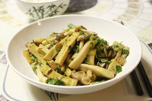 Đậu phụ xào măng: Để làm món này, đậu phụ được chiên giòn rồi cắt thành hình con chì đem xào chung với măng tước sợi. Món ăn này được đặc trưng bởi vị chua của măng quyện với vị ngậy của đậu rất hợp để ăn chung với cơm.