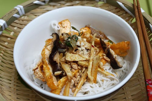 Bún đậu phụ xào chay: Những miếng đậu phụ được chiên vàng óng kết hợp với nấm xào, lạc rang đem ăn chung với bún trắng rất ngon miệng.
