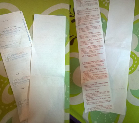 Bà cho biết khi nhân viên ngành điện đến thu sau đó, tìm lại hóa đơn đã nộp, bà mới vỡ lẽ là tờ biên nhận giả vì đã mờ hết mực in. "Nhân viên thu ngân nói đây là hóa đơn từng được dùng trong đợt thí điểm hóa đơn điện tử hồi 2014, khi đó mặt sau không in mực đỏ như hiện hành", bà nói thêm.