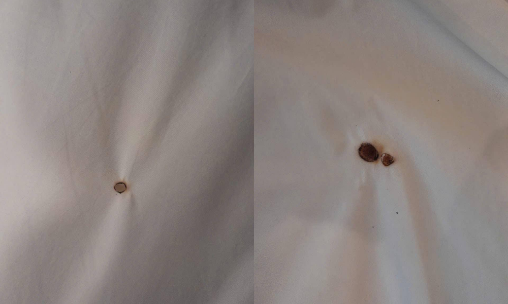 Hình ảnh đính kèm cho thấy một vết cháy nhỏ trên mặt ga giường, cùng giấy biên nhận viết tay ghi nội dung "bồi thường thiệt hại đệm do hút thuốc làm thủng", với số tiền 4,8 triệu đồng.