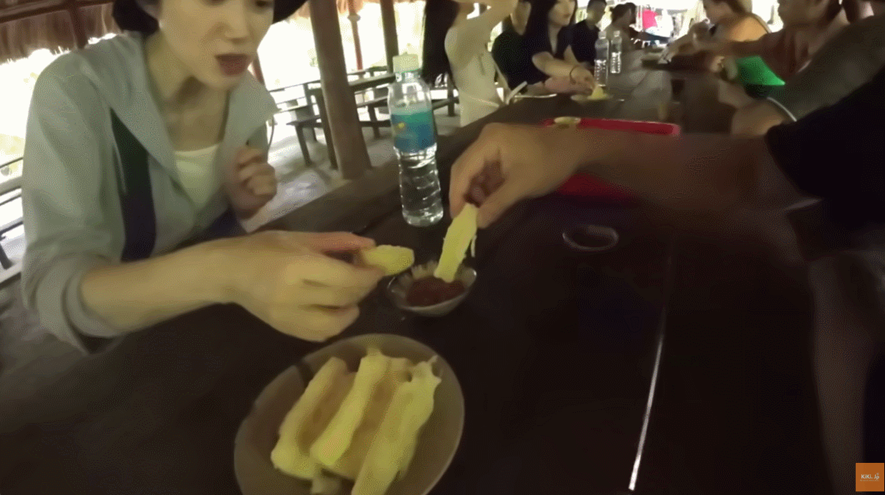 "Đây là sắn nhỉ, ăn khá giống khoai nhưng không ngọt bằng. Có vẻ như bây giờ ăn gì cũng thấy ngon vì vừa mệt vừa đói. Nhưng thực sự càng ăn càng thấy ngon", Ayumi hài hước nói.