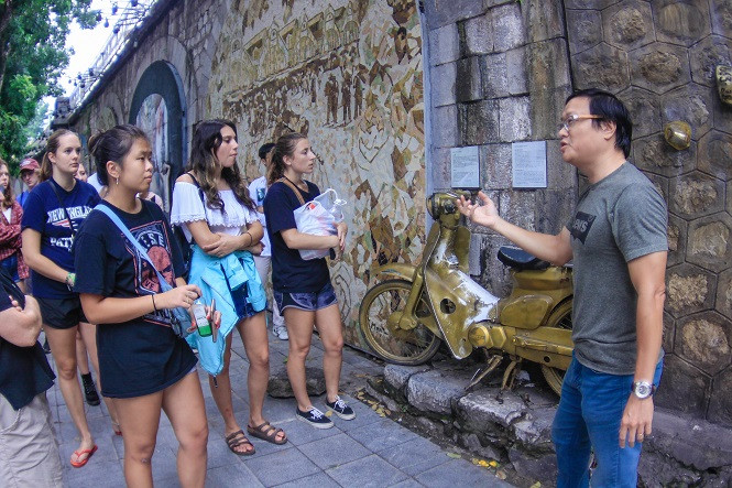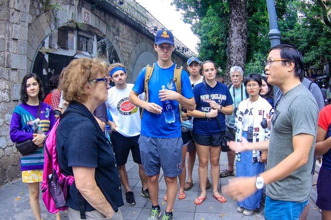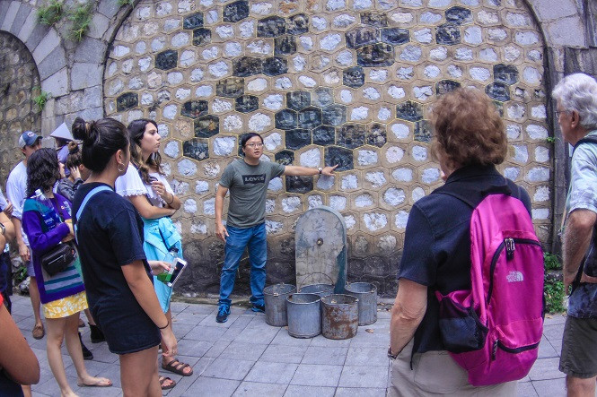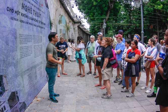 Mỗi đoàn khách chỉ dưới 20 người, đủ quây quần quanh nghệ sĩ nghe chuyện về Hà Nội. "Mỗi lần đi tour về đều kiệt sức vì khách hỏi quá nhiều", anh Sơn chia sẻ.