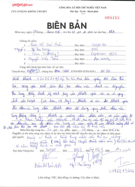 Để đảm bảo ổn định tình hình, tổ trực đã báo cho giám sát viên của HGS cử 1 nhân viên mới đến để làm thủ tục cho hành khách. Sau đó, đại diện của Vietjet đã lập biên bản các bên liên quan và báo cáo bộ phận liên quan để xử lý.
