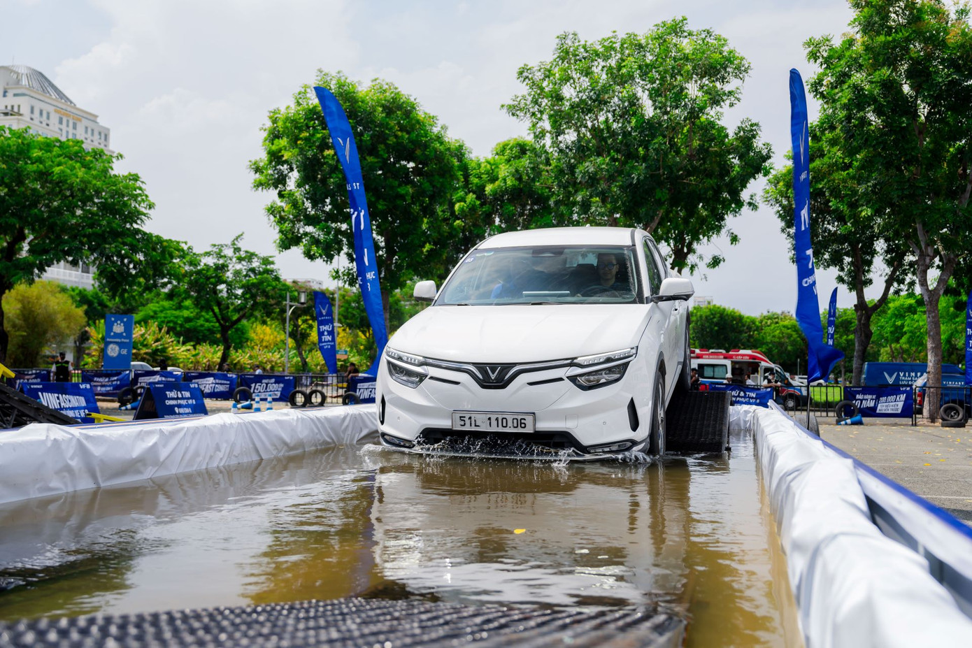 Tiếp đến là một trong những bài thử “hard-core” nhất: vượt hố nước sâu 30 cm. VinFast VF 8 vượt qua dễ dàng nhờ bộ pin và động cơ đạt tiêu chuẩn chống nước IP67 - ưu điểm đặc trưng của xe điện. Trước khi thoát khỏi hố nước, người dùng được hướng dẫn dừng xe trên dốc một lúc để nước thoát ra ngoài. Đây là một kinh nghiệm rất hay để áp dụng trong việc sử dụng xe hàng ngày.