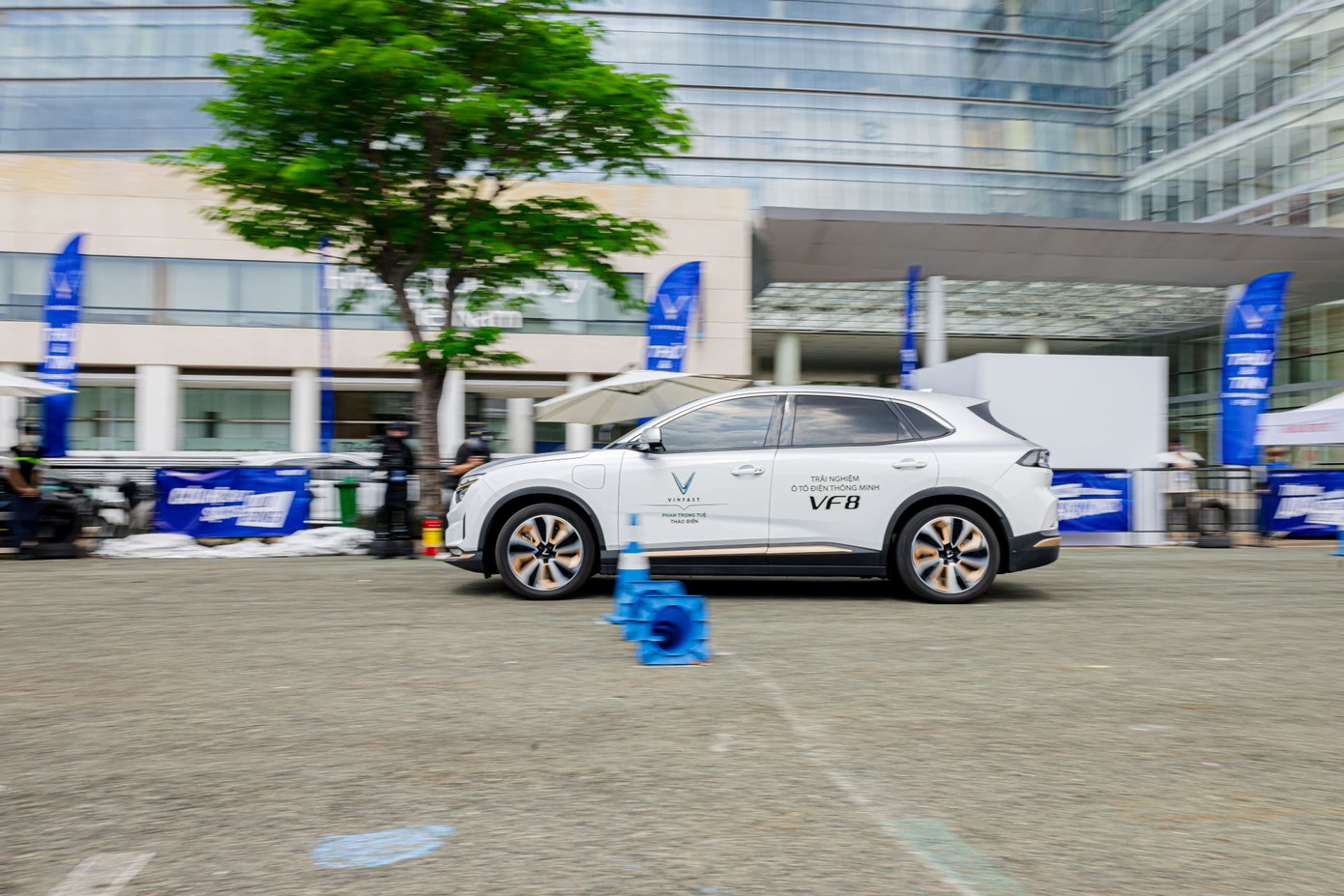 Khởi đầu với bài zigzag, nơi người lái vừa có cơ hội làm quen VF 8, vừa có cơ hội kiểm tra phản ứng của hệ thống cân bằng điện tử (ESC) và chức năng chống lật (ROM) khi liên tục đánh lái gấp luồn lách qua các chướng ngại vật.