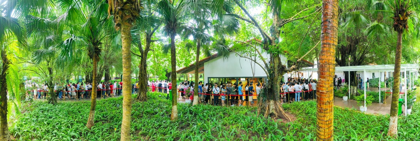 Khảo sát thực tế, 7h30 sáng, mặc dù trời còn mưa, nhưng hơn 400 khách  đã  có mặt, xếp hàng check-in tại khu vực đăng ký tham quan nhà mẫu trong công viên mùa xuân