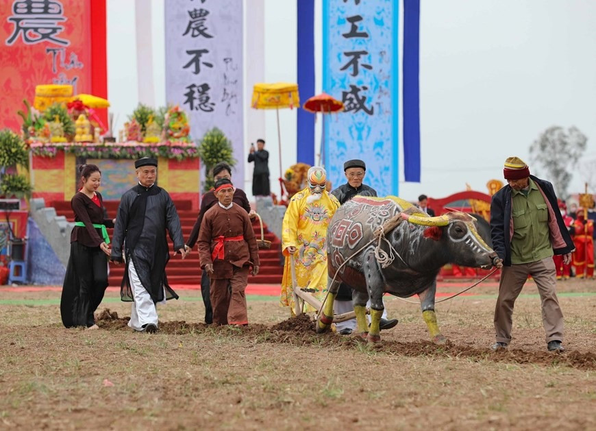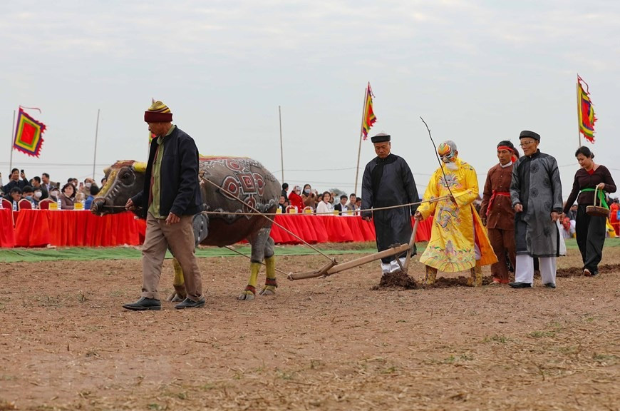 | Thực hiện nghi thức với đường cày đầu Xuân tại Lễ khai hội Tịch điền Đọi Sơn năm 2023. (Ảnh: Thanh Tùng/TTXVN) |