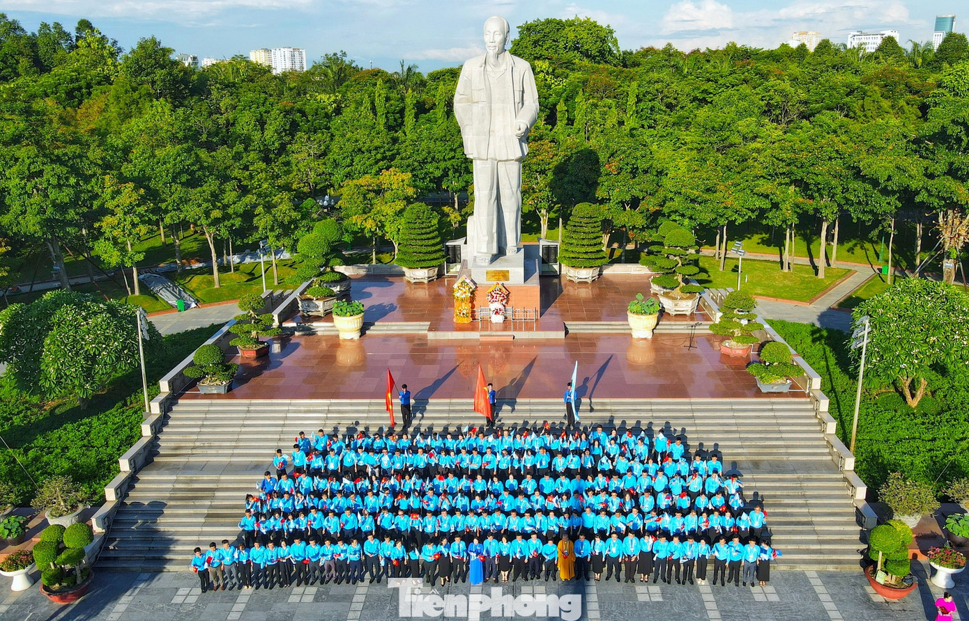 | Đại biểu chụp hình lưu niệm dưới chân tượng đài Chủ tịch Hồ Chí Minh. |