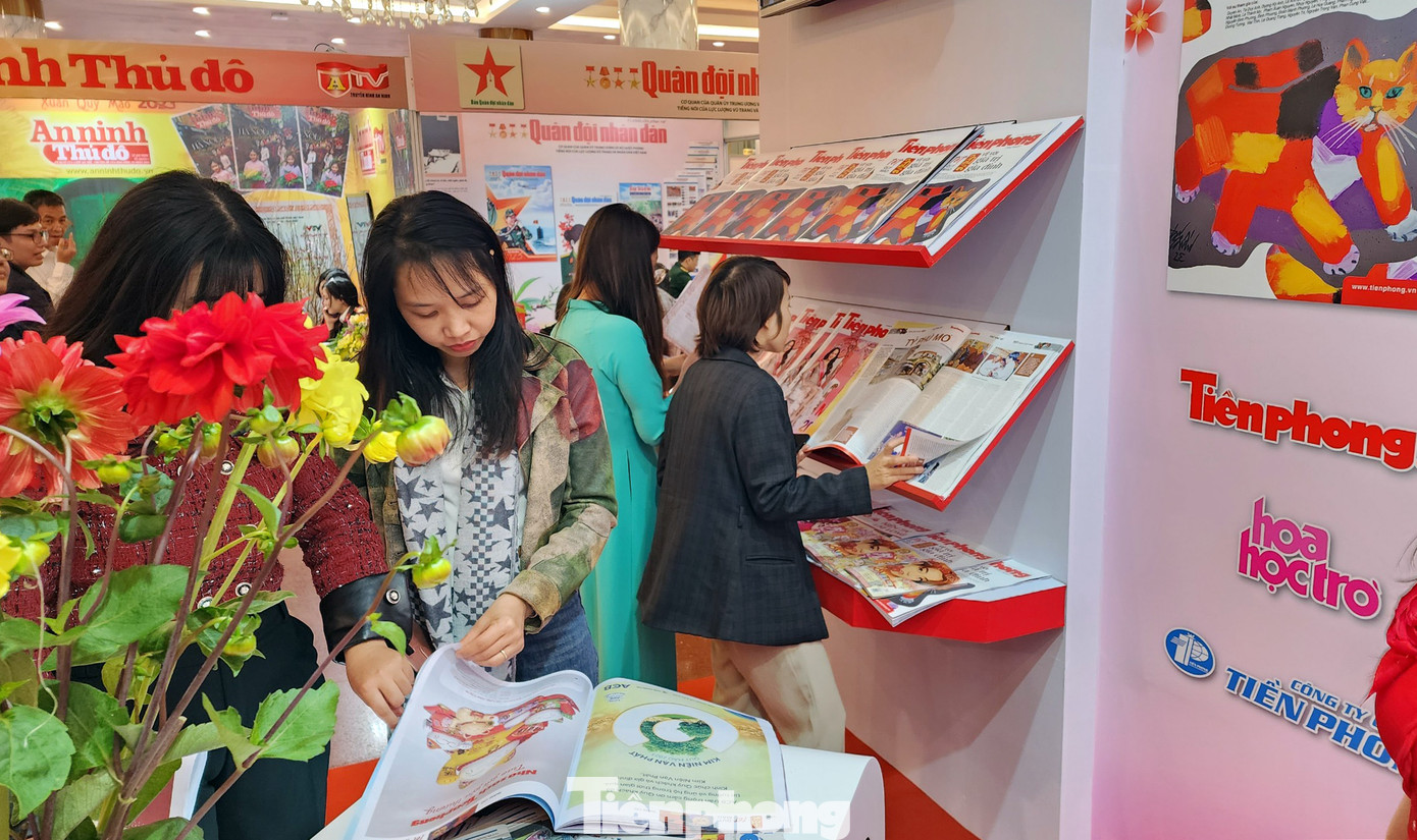 | Báo Tiền Phong trưng bày, giới thiệu các ấn phẩm đặc biệt Xuân Quý Mão và nhật báo. Ảnh: Trọng Quân |