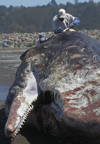 Xác cá nhà táng khổng lồ, dài hơn 15m bị trôi dạt vào khu phía nam của bãi biển Sharp Park ở Pacifica, California, Mỹ. Các chuyên gia đã tiến hành mổ con cá ngay tại bãi biển để tìm nguyên nhân cái chết.