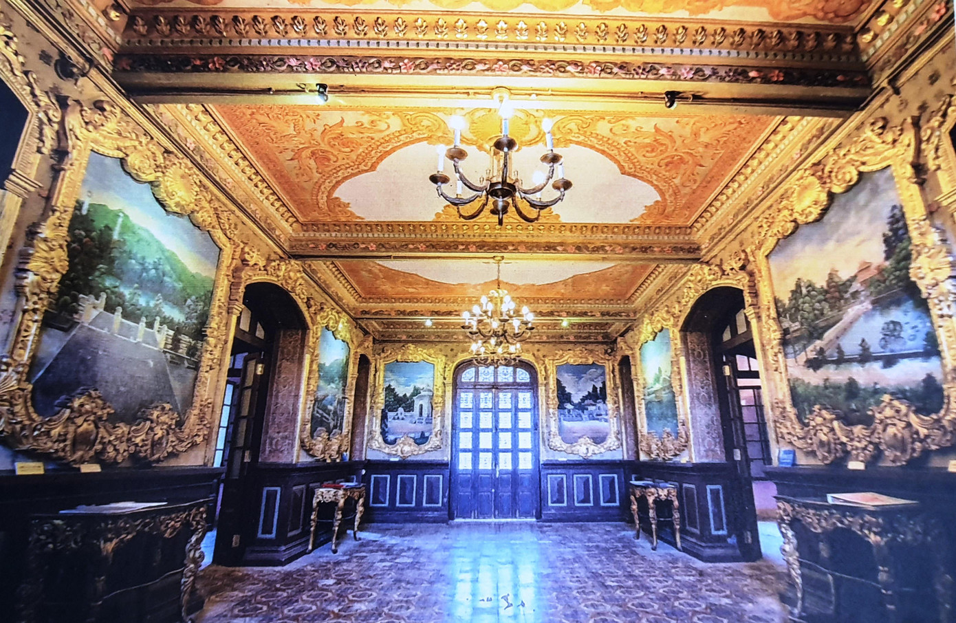 | Nội thất đại sảnh của cung điện gồm 20 phòng. Trong đó, khu phòng khách và hai phòng chiêu đãi ở tầng 1 là nơi đáng lưu ý. Đặc biệt, trong phòng khách có sáu bức tranh tường hết sức nổi tiếng vẽ cảnh lăng các vua Gia Long, Minh Mạng, Thiệu Trị, Tự Ðức, Khải Ðịnh, Ðồng Khánh. Tranh vẽ bằng bột màu trên nền tường và những bộ khung thếp vàng bao quanh, 26 vòm cửa của cả căn phòng làm bằng gỗ mạ vàng với những hoa văn chạm trổ rất tinh vi, sinh động. Ảnh TL |