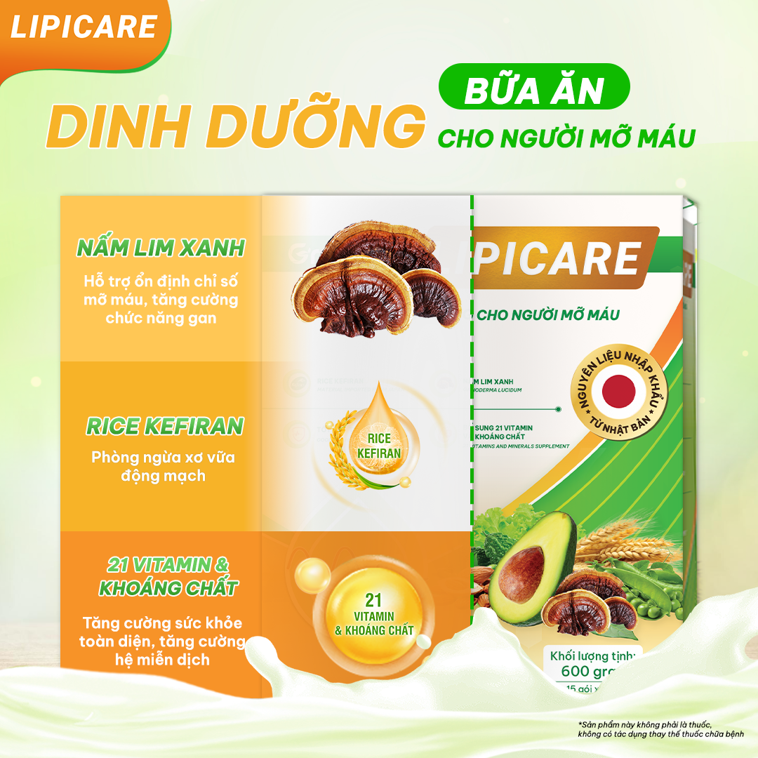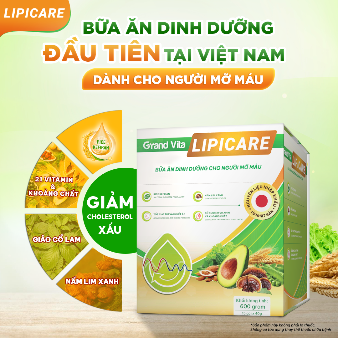 Lipicare là bữa ăn dinh dưỡng chuyên biệt đầu tiên tại Việt Nam dành riêng cho người mỡ máu. Sản phẩm được phát triển dựa trên nghiên cứu khoa học tiên tiến kết hợp giữa hoạt chất Rice-Kefiran – một phát minh đột phá của giáo sư Nhật Bản và các dưỡng chất thiết yếu khác.
