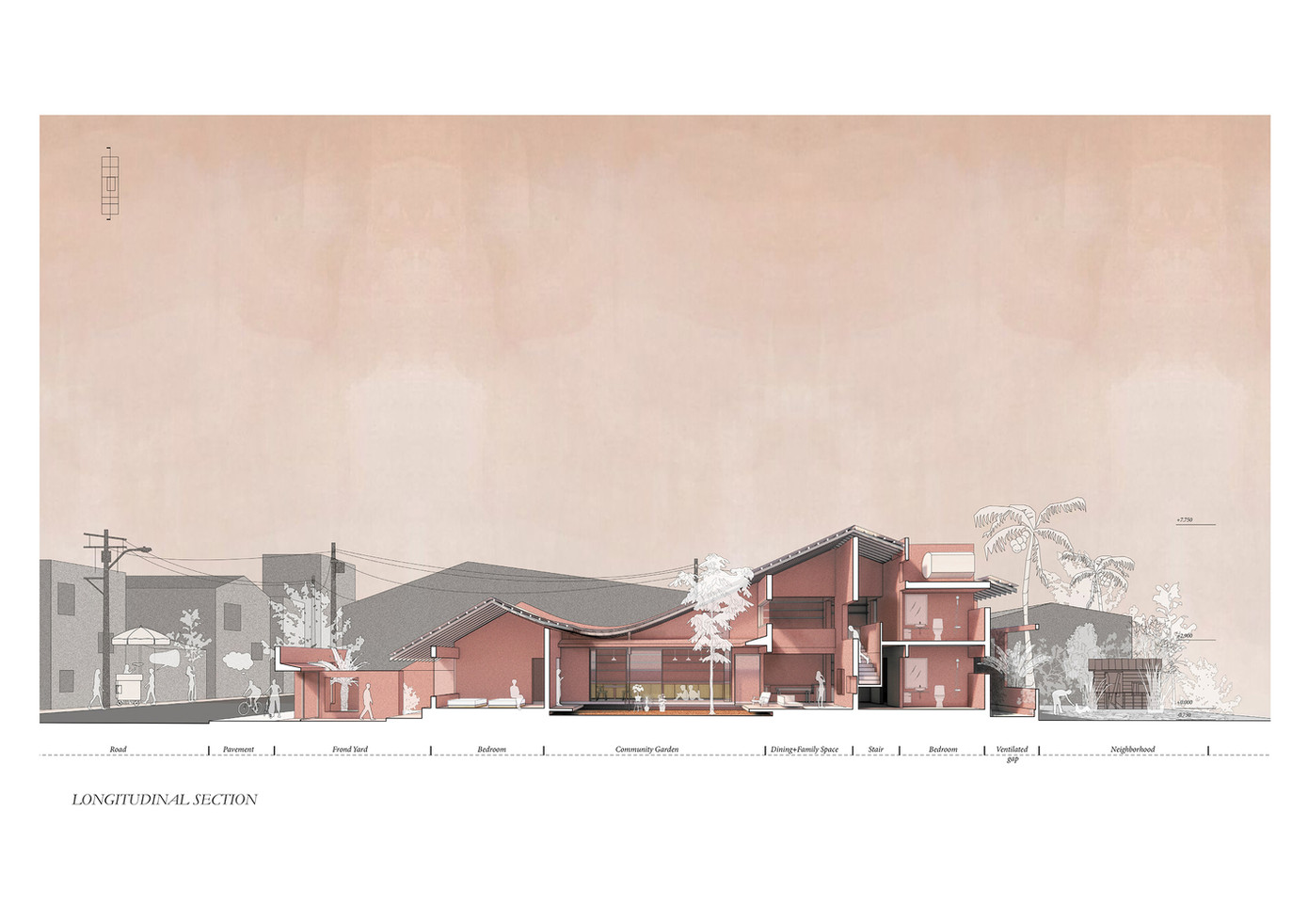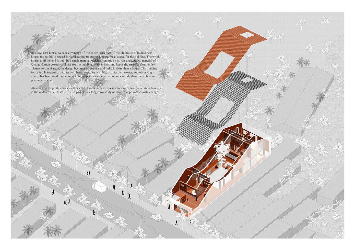 Ngôi nhà là một cấu trúc xoắn ốc để các khối không gian cuộn lại với nhau và xoay quanh một khu vườn trung tâm như một giải pháp vi khí hậu. Không gian được thiết kế cho bốn gia đình cùng chung sống: khối bà + dì, khối bố mẹ và khối gia đình hai con trai.