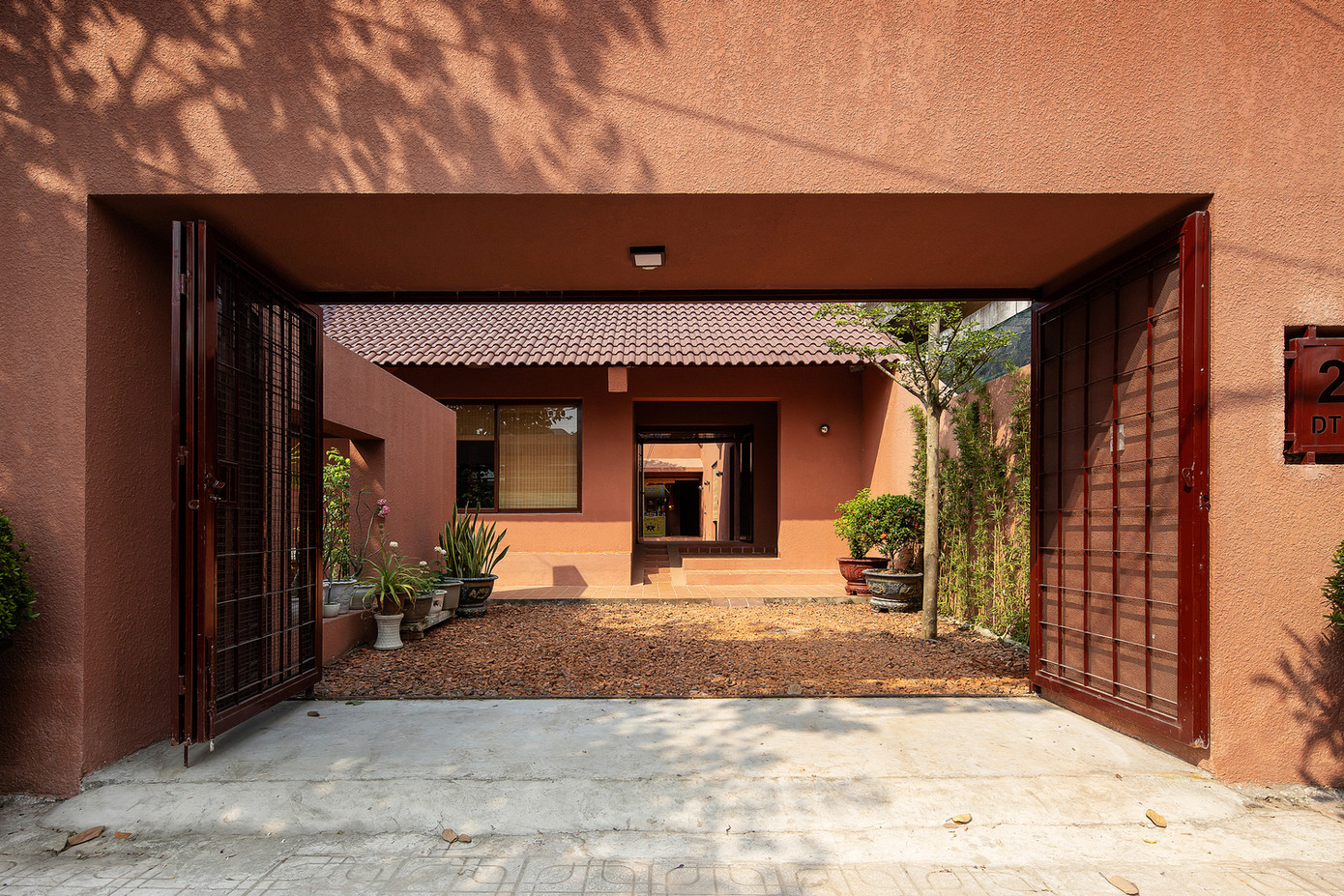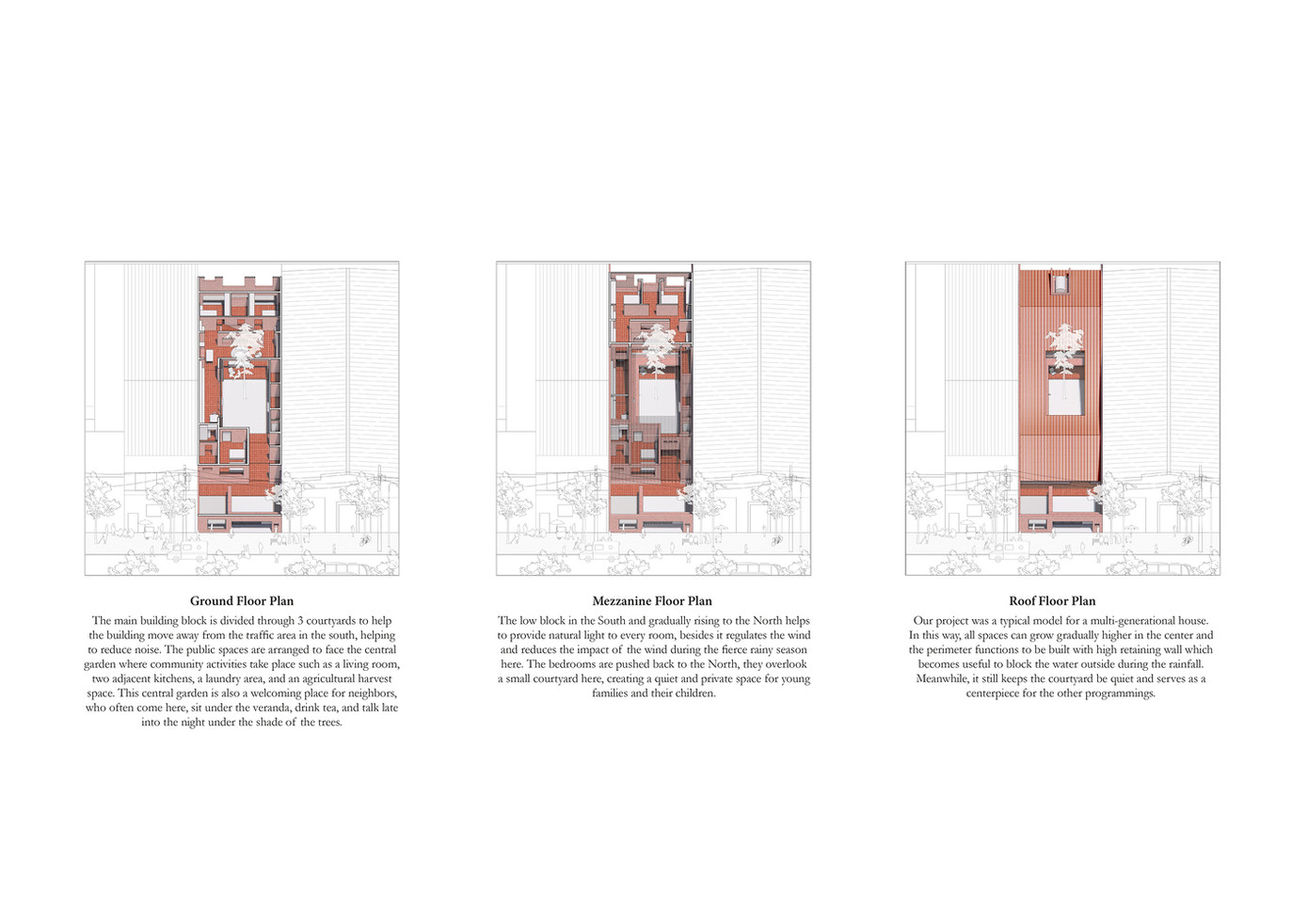 Khối nhà chính được chia làm 3 phần và đẩy lùi vào trong để tránh tiếng ồn từ đường cái. Các không gian công cộng như phòng khách, hai bếp liền kề, khu giặt là và không gian thu hoạch nông sản được bố trí hướng ra khu vườn trung tâm.