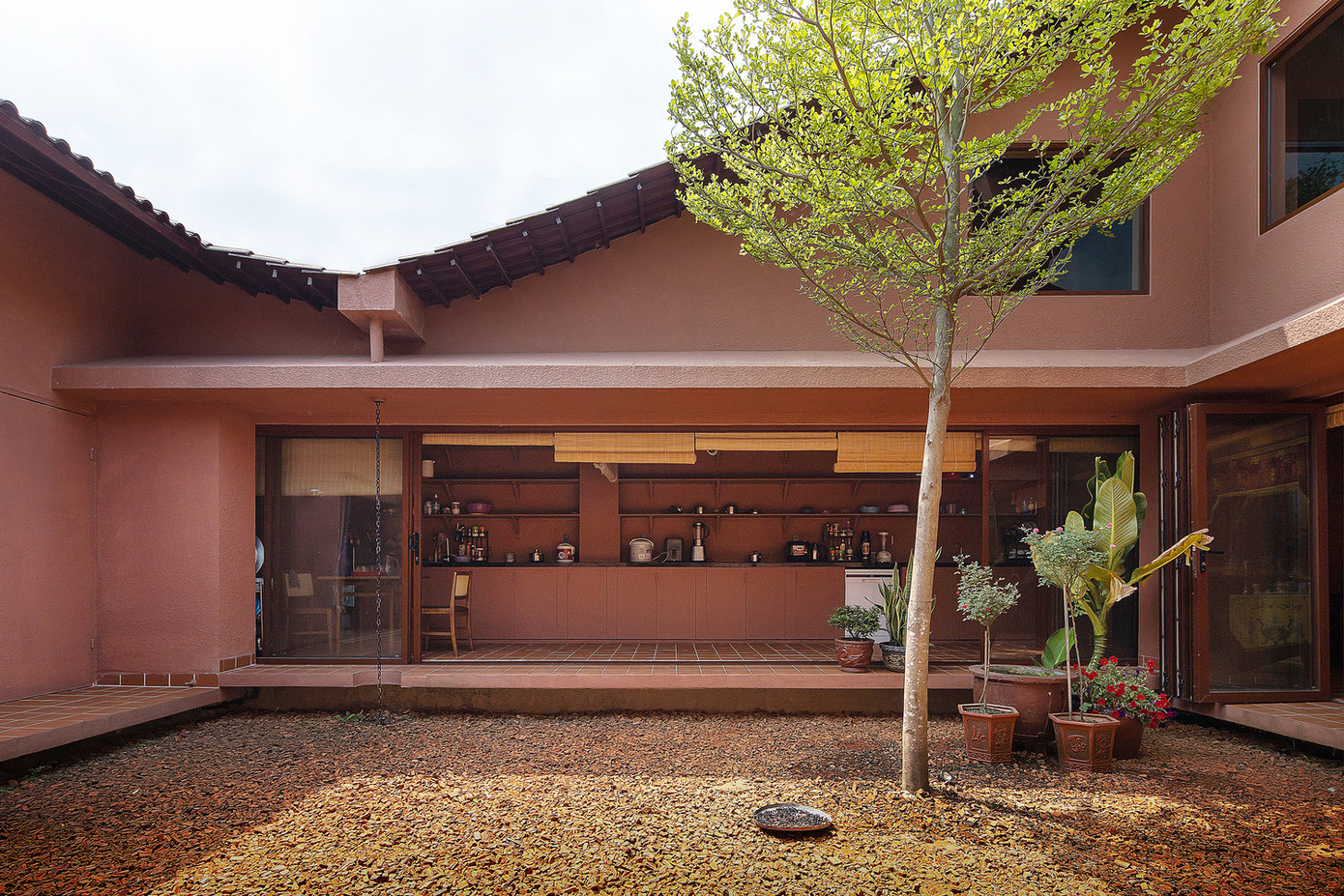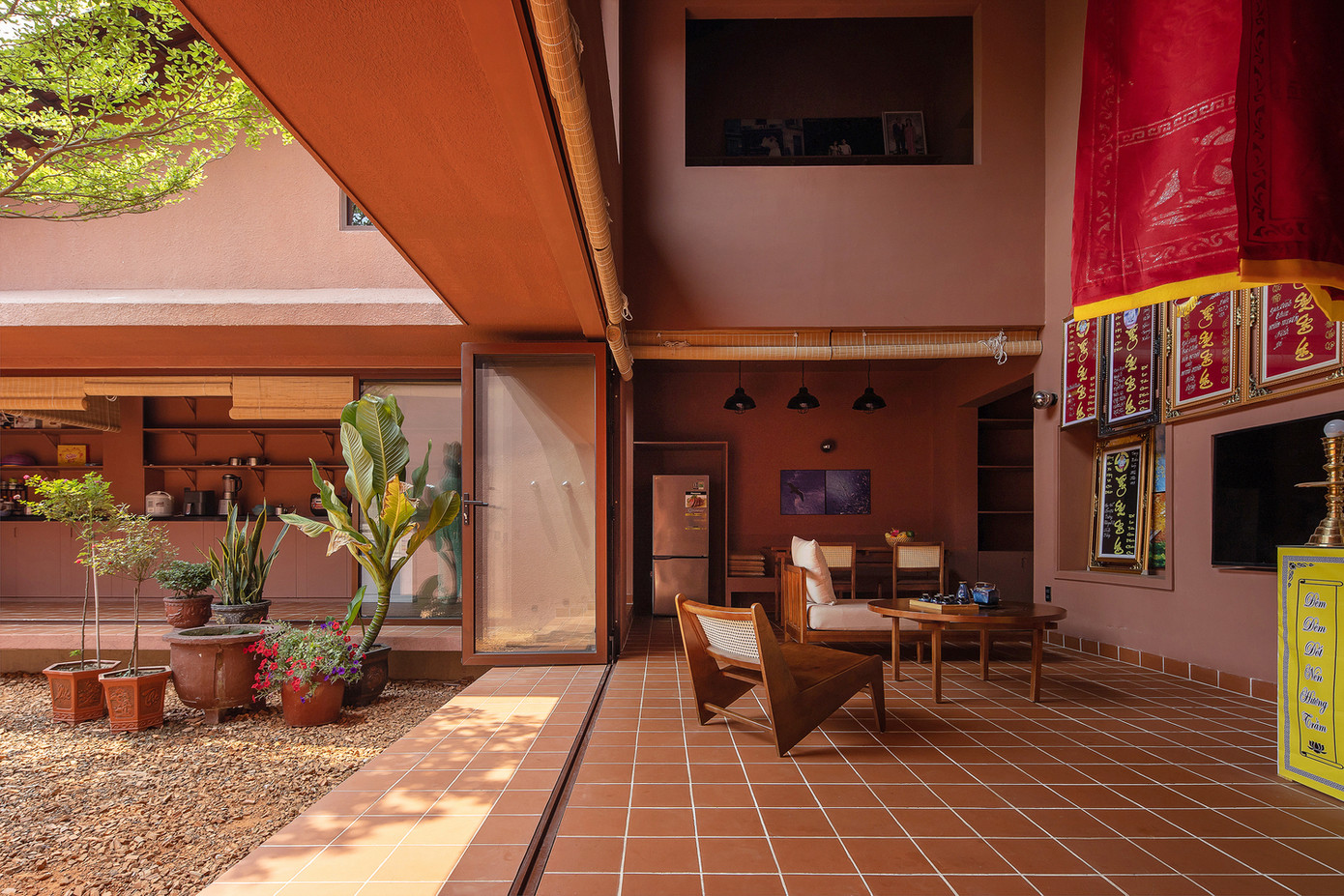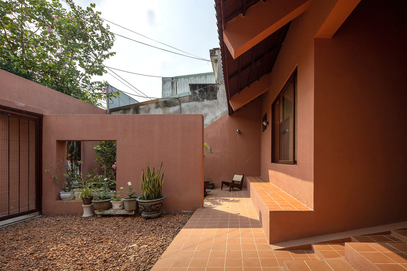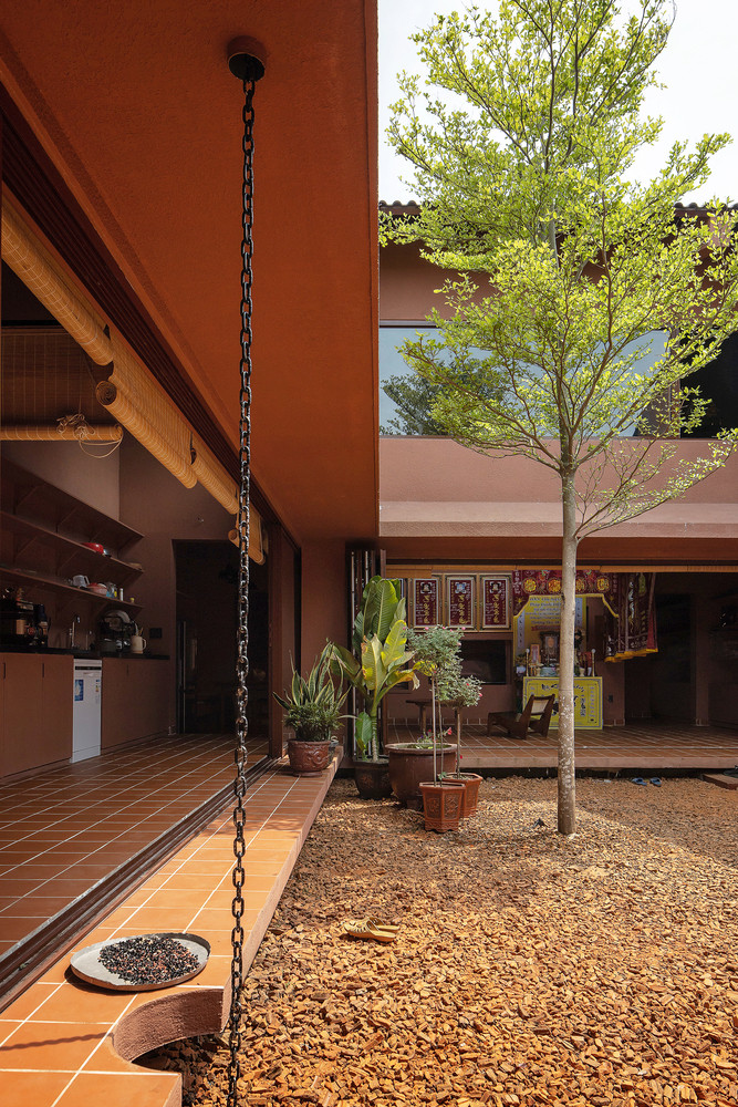 Khu vườn trung tâm này cũng là nơi chào đón hàng xóm, ngồi dưới hiên uống trà và trò chuyện đến khuya dưới bóng cây.