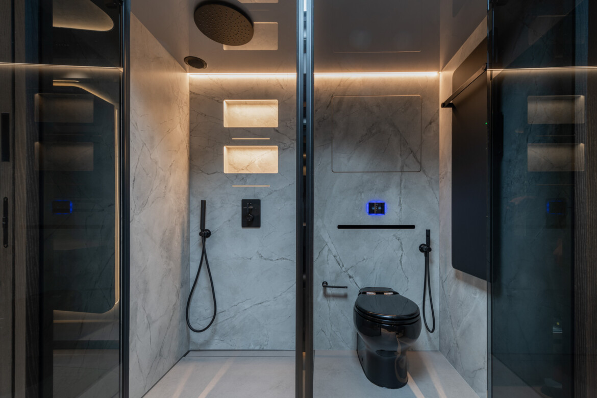 Big Boy 1200 còn có một phòng tắm sang trọng theo phong cách spa với tường ốp đá, đi kèm đầy đủ các tiện ích để phục vụ tối đa nhu cầu sinh hoạt của người dùng như: vòi sen, bồn cầu, bồn rửa và khu vực trang điểm riêng biệt.