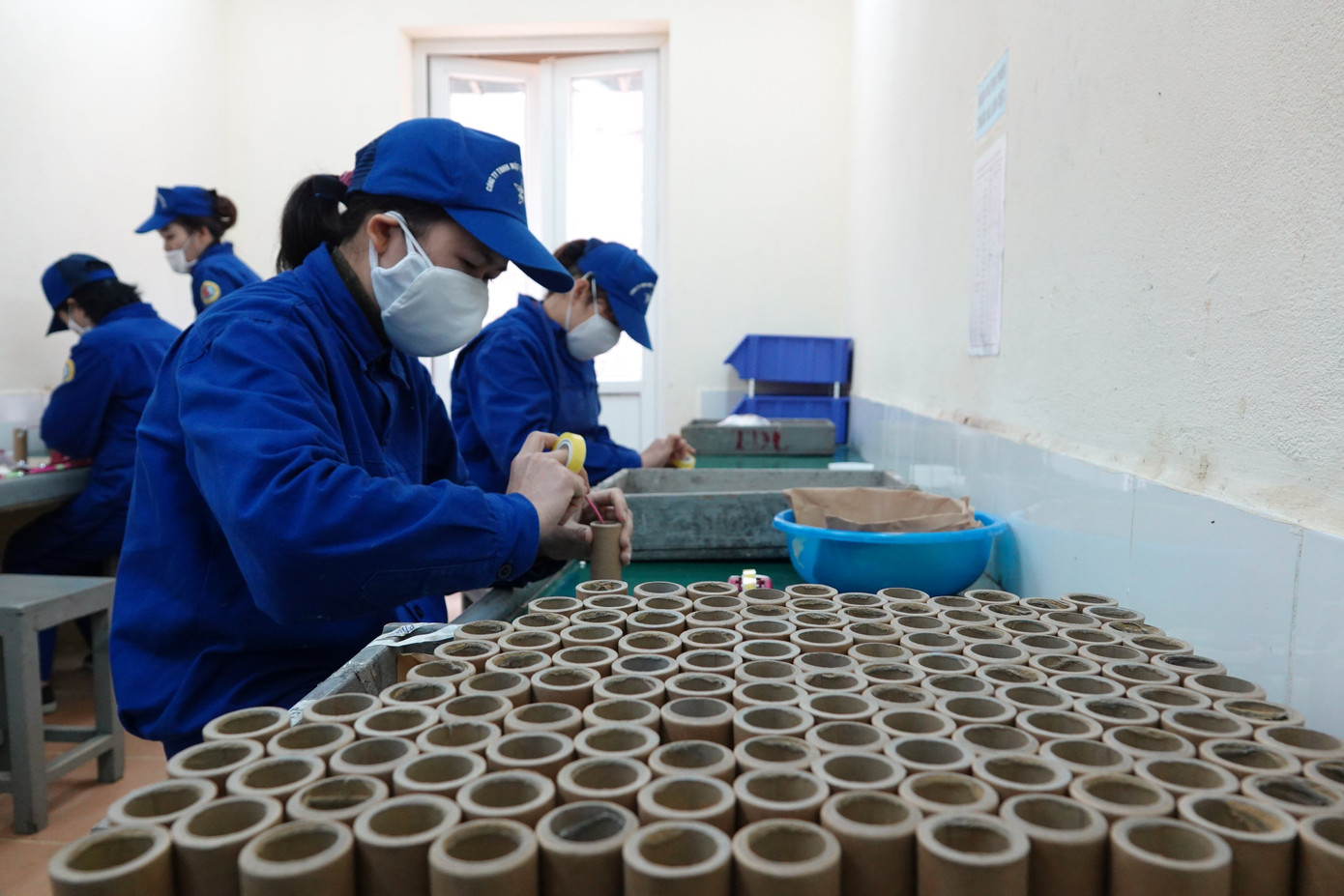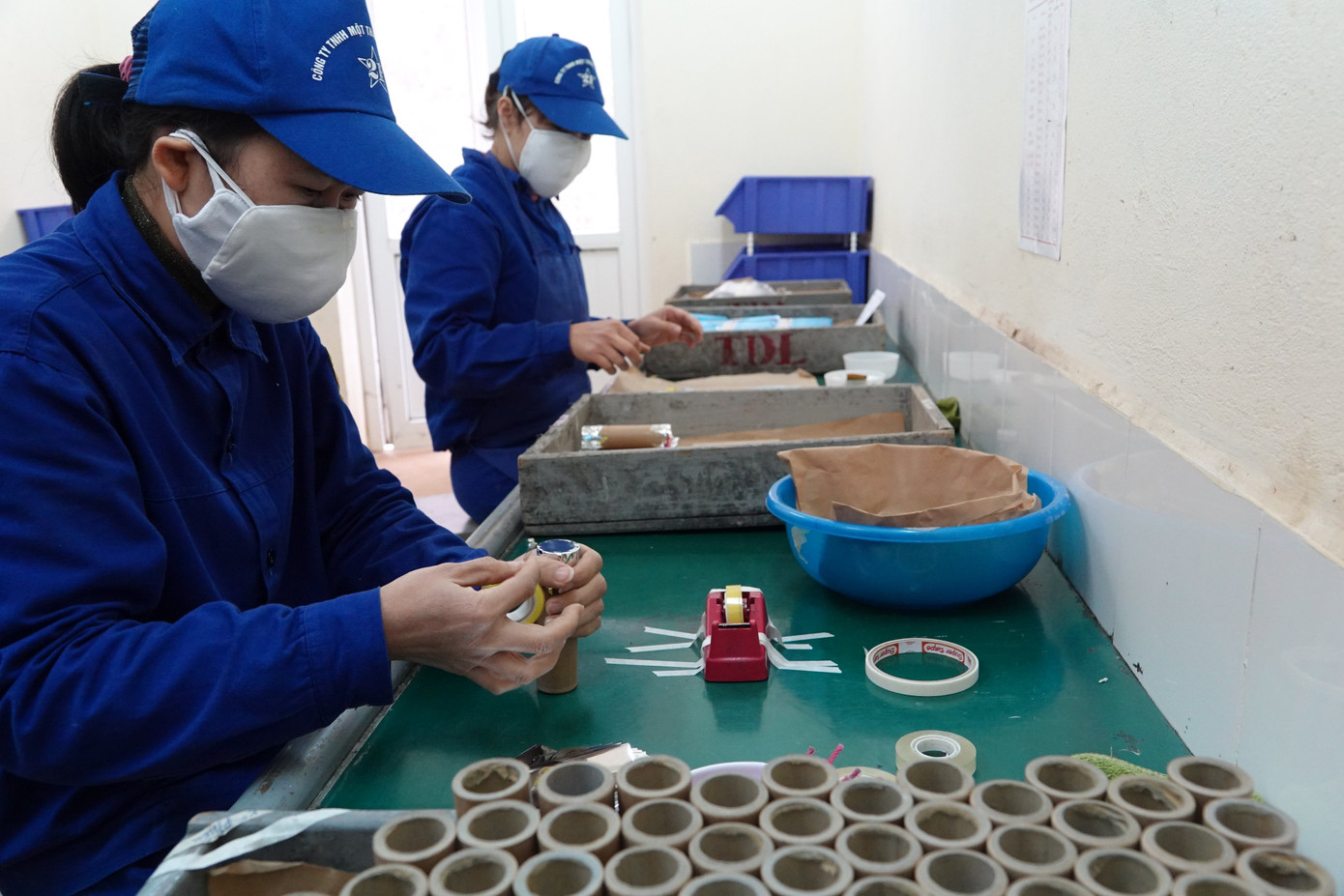 Mỗi kíp nhồi có 3 công nhân, trong đó hai người cẩn thận đóng thuốc vào ống lường đã lắp ống giấy, người còn lại sẽ lắp đệm đất, đệm giấy rồi đưa chày nén vào.