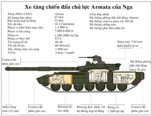 Xe tăng Armata được trang bị cả hệ thống chống mìn cùng hàng loạt camera độ phân giải cao, cho phép người điều khiển quan sát toàn bộ các hướng xung quanh thân xe.