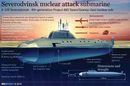 Tờ Sunday Times của Anh từng đưa tin với tàu ngầm hạt nhân đa năng Severodvinsk, Nga đã trở thành quốc gia có công nghệ hàng đầu thế giới về hạm đội tàu ngầm. Báo trên nhấn mạnh Severodvinsk hầu như không thể bị phát hiện trong các đại dương, khiến tàu này trở nên bất khả xâm phạm khi đối mặt với các hệ thống vũ khí chống hạm mới nhất.