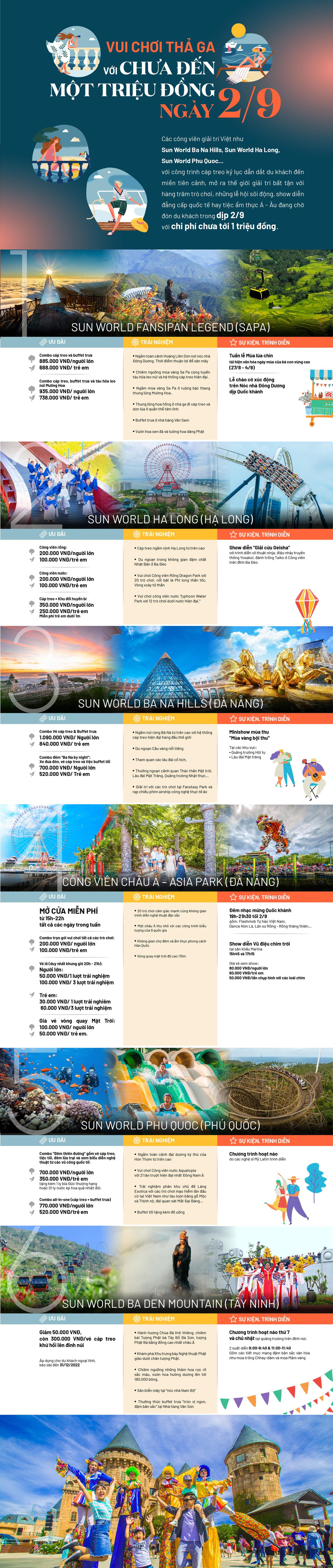 Các công viên giải trí Việt như Sun World Ba Na Hills, Sun World Ha Long, Sun World Phu Quoc… với công trình cáp treo kỷ lục dẫn dắt du khách đến miền tiên cảnh, thế giới giải trí bất tận với hàng trăm trò chơi, những lễ hội sông động, show diễn đẳng cấp và tiệc ẩm thực thịnh soạn đang chờ đón du khách dịp 2/9.