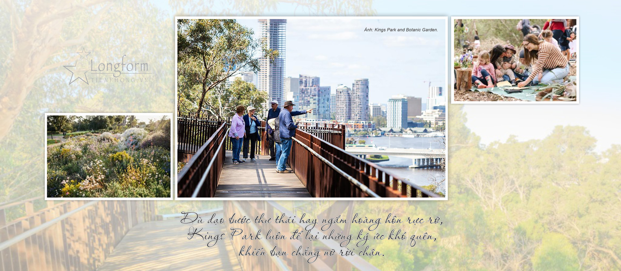 Trải rộng trên diện tích hơn 400 hecta ngay trung tâm thành phố Perth, Kings Park và Vườn Bách Thảo (Botanic Garden) là một trong những công viên nội đô lớn và đẹp nhất thế giới. Từ đây, du khách có thể chiêm ngưỡng toàn cảnh “thành phố ánh sáng” và dòng sông Swan thơ mộng.