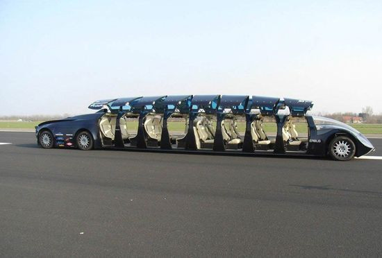 Chiếc siêu xe có giá thành khoảng 7 triệu euro này dài 15 mét, rộng 2,5 mét, cao 1,65 mét, 12 cửa lật ở hai bên.