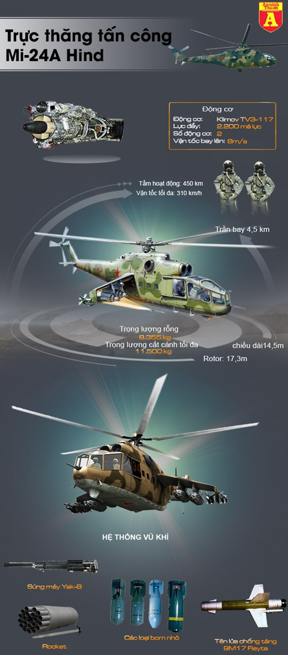 Mi-24 được Tập đoàn quân sự Mil Moscow nghiên cứu và phát triển từ những năm đầu thập niên 60 của thế kỷ XX và đưa vào sử dụng trong quân đội Xô Viết từ năm 1972, loại trực thăng này được sản xuất với khá nhiều biến thể bao gồm Mi-24A/BM|BMT/U. Các biến thể này có buồng lái với phi công và hoa tiêu ngồi song song với nhau. Trong khi đó, các biến thể Mi-24D/P/PK/PN/PS, Mi-25, Mi-35/35M/35P có buồng lái hình giọt nước với phi công ngồi trước và hoa tiêu ngồi sau.