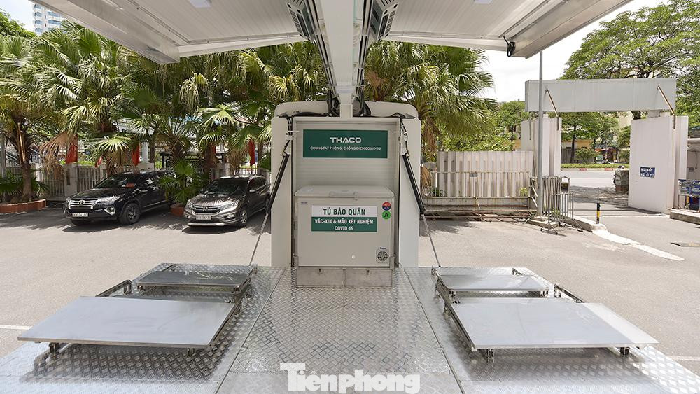 Lòng thùng xe bung ra, kết hợp với sàn chính tạo thành không gian rộng rãi để bố trí bàn ghế phục vụ khám sàng lọc, tiêm ngừa. Không gian sàn xe sử dụng làm khu vực tiêm, nằm độc lập với mặt đường và những người xếp hàng bên dưới, đảm bảo các quy định giãn cách an toàn.