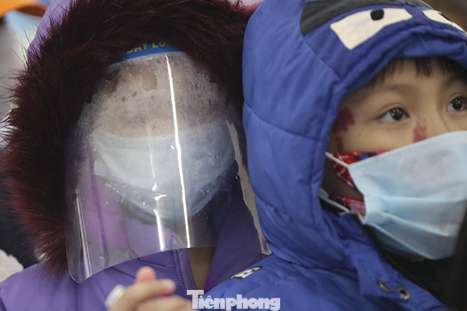 Các em đều đeo khẩu trang khi đi xét nghiệm, một số cần thận dùng tấm kính chắn giọt bắn.