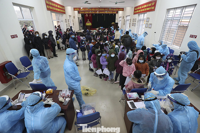 Rất đông học sinh trường tiểu học Xuân Phương đến nhà văn hóa tổ dân phố số 7 làm xét nghiệm COVID-19.