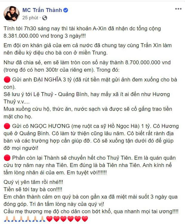 Trấn Thành công khai việc sử dụng số tiền trên như sau: 3 tỉ đồng gửi cho MC Đại Nghĩa, 1 tỉ đồng gửi mẹ ca sĩ Hồ Ngọc Hà và số còn lại 4,7 tỉ đồng sẽ chuyển hết cho Thủy Tiên. Theo Trấn Thành, vì anh bận quay phim nên không thể ra miền Trung thời điểm đó. “Và em đã “chọn mặt gửi vàng” để những gì quý vị đóng góp đến trực tiếp tận tau từng người dân”- Trấn Thành viết.