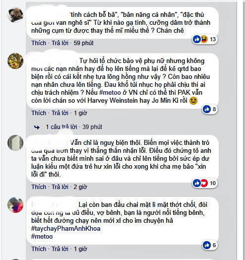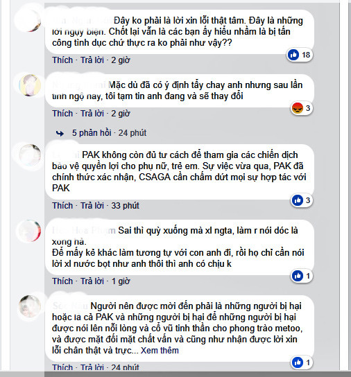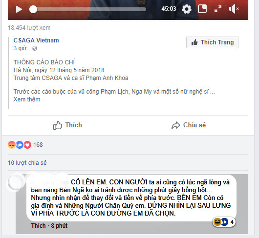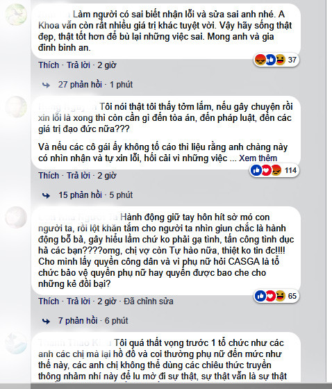Sau khi đăng tải đoạn đối thoại về lùm xùm gạ tình của Phạm Anh Khoa, nhiều bình luận gay gắt từ người hâm mộ dành cho nam ca sĩ ngay lập tức xuất hiện trên fanpage của CSAGA (Tổ chức Phi chính Phủ, hoạt động trong lĩnh vực bình đẳng giới, bảo vệ phụ nữ và trẻ em gái) (Ảnh: FBNV).